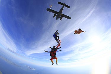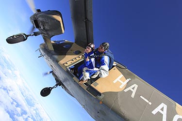![]() Immer wieder ein Nervenkitzel: Aussteigen aus der Absetzmaschine vor dem freien Fall aus 4000 Metern Höhe |