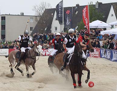 Durch den schnellen Lauf des Polopferdes von Tim Ward/Team König Pilsener in der Spielverlängerung konnte der charmante Brite schließlich durch einen harten Schlag auf den roten Ball ein umjubeltes Tor schlagen und sich mit 12 : 11 gegen den Favoriten Lanson durchsetzen. Auch dieses Jahr traten sechs Polo-Topteams gegeneinander an und spielten vor mehr als 10.000 Zuschauern in der Beach Polo Arena um den begehrten Titel in dieser noch jungen, attraktiven Strand-Variante des Polosports. Die Profi-Spieler und über 40 argentinische Polo-Pferde zeigten in Zweierteams eine der adrenalinreichsten Teamsportarten der Welt.