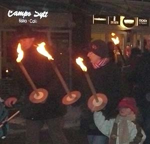 Mit Fackeln und guter Laune bewaffnet ziehen Einheimische und Gäste gemeinsam, wie hier in Westerland durch die Fußgängerzone Friedrichstraße, zum Biikefeuer. |