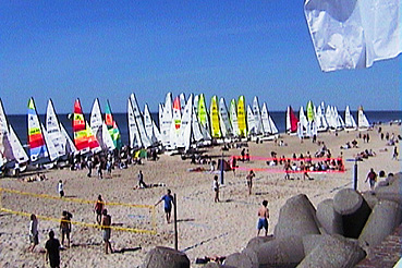 Das letztjährige Sylter Pfingstwochenende stand ganz im Zeichen eines wassersportlichen Top-Events: Drei Tage lang wurde die Westküste vor Westerland Schauplatz der Hobie Catamarane. Bereits zum fünften Mal wurde in der Hobie 16 Klasse die deutsche Meisterschaft und eine internationale deutsche Bestenermittlung der Hobie Tiger-Segler vor dem Brandenburger Strand ausgetragen. Bei supersonnigem Pfingstwetter und Windstärke 2 bis 3 am Samstag strahlten Organisator Willy Trautmann und Moderator Sönke Nielsen um die Wette. |