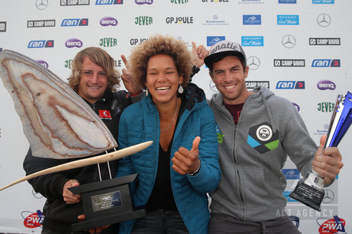 Der Sylt Slalom Sieger Italiener Matteo Iachino (re.), der Weltranglistenerste Dieter van der Eyken aus Belgien nahm den WM-Pokal in Empfang. Bei den Damen sicherte sich Sarah-Quita Offringa aus Aruba den Weltmeistertitel. |