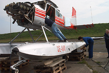 Teilweise demontiert: In der Sylter Flugwerft wird die Cessna 185 mit schwedischem Rufzeichen in Einzelteile zerlegt |