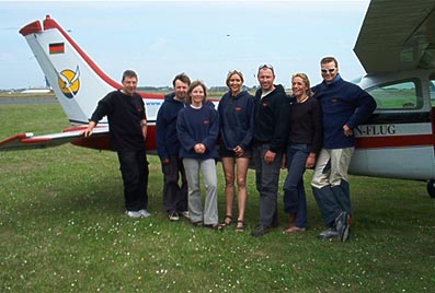 Die Crew der Himmelsstürmer von links: Clemens (Pilot Sylt Air), Ray (Tandemmaster und Teamspringer), Anke (Video-Springerin), Heike (Team-Springerin), Karl-Jörg (Tandemmaster und Sprunglehrer), Ulli (Manifest und Fallschirmspringerin) sowie der Tandemmaster Yorck |