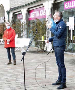 „Es war für die vier Männer mit Sicherheit keine einfache Situation, allein schon weil die ganze Stimmung ziemlich angespannt war. Dennoch zolle ich den Bürgermeister-Kandidaten für ihren Mut Respekt, dass sie sich nicht weggeduckt, sondern das Gespräch mit uns gesucht haben“, sagt Demo-Veranstalterin Jali Schneider, wie die Sylter Rundschau berichtete. Bürgermeister Kandidat Clemens Raab (re.) betonte u.a. in seiner Rede vor dem Westerländer Rathaus an die Demonstranten: „Die Hilfsgelder müssen endlich fließen, wenn sie beantragt worden sind. Es kann wirklich nicht sein, dass Menschen noch immer auf Hilfen warten müsse, da muss was passieren.“ |