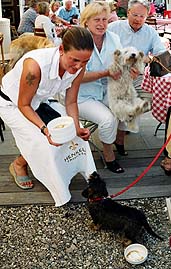 Nahezu 30 wohlhabende Hundebesitzer und ihre Lieblinge trafen sich zu einem Hunde-Luxus-Menü im Weingarten des Kampener Restaurants „Zum Österreicher“. Aufmerksame Kellnerinnen umsorgten die vierbeinigen Gäste mit Leckereien vom Küchenchef, der sich nach dem Kochbuch “3 Sterne-Küche für den Hund“ richtete. Die Autorin, Petra Grell-Hansohm, (Einrichtungen Haus & Garten, Sylt-Hamburg-Mallorca) hatte die Idee: „Luxushunde fressen fürs Tierheim“. |