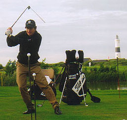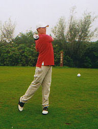 Mut und Spielkönnen bewies der jüngste Teilnehmer des Golfturniers Christian Kappelhoff-Wulff. Er überraschte nicht nur durch seine Spieldisziplin sondern auch durch Courage als Show-Partner des TV-Golf-Stars Stephan Gandl bei seinen Trickvorführungen. | ![]() Nachwuchstalent Christian Kappelhoff-Wulff beim gänzenden Abschlag |