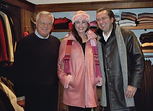 Im modischen perlrosa Mantel mit korrespondierender Pelzkappe Misses Germany Claudia Ehlert zwischen den beiden Steffi-Moden-Chefs Horst Arno Gülcher (li.) und Horst Axel Gülcher |