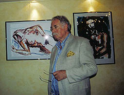 Klaus Hahn, der lange Jahre in Kampen eine eigene Galerie führte und zur Zeit in Berlin lebt und arbeitet, war begeistert von dem Konzert und natürlich von der Künstlerin Ann Hampton Callaway selbst. Hier im Bild vor seinen Werken der Ausstellung im Kaamp Hüs. |