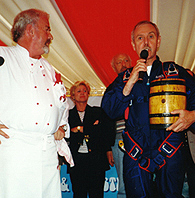 Eine Gaudi für 1000 Zuschauer sollte es werden, wenn der erste Matjes am Fallschirm die Flug/-Matjessaison einläutet. Statt aus der Luft sprang Fallschirmsprung-Lehrer Klaus Holzapfel (LSV Flensburg) mit dem Fässchen auf die Bühne zu dem singenden "Jönne Gosch" (Foto), weil Petrus zuviel Wind bescherte. In der Bootshalle wurde die luftige Matjes-Saison trotz allem kräftig gefeiert. |